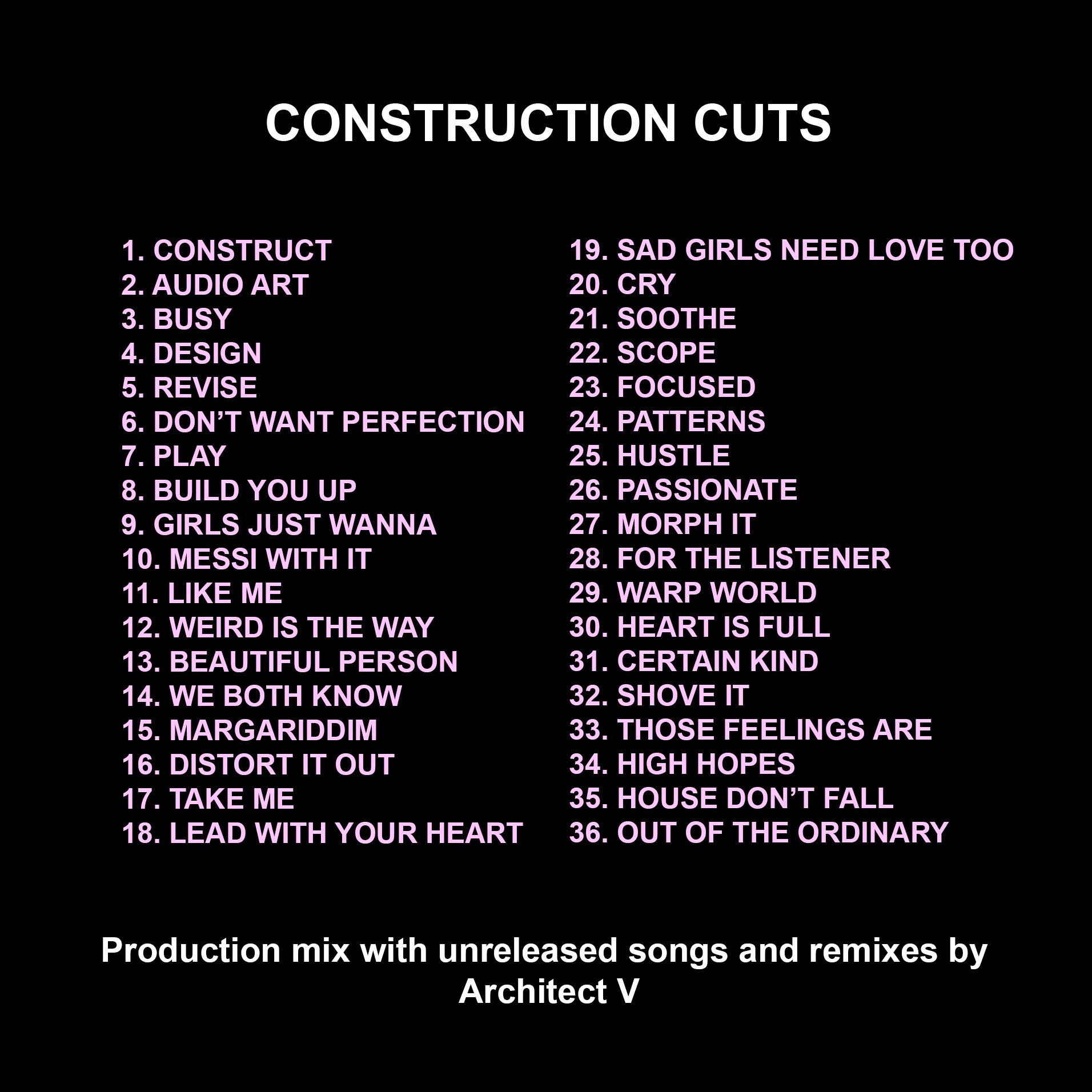 A production mix of my recent songs and remixes. It expresses my love for music and encourages people to follow their passion. It has architecture themes and emphasizes taking care of yourself, especially when you are down. I am grateful to those taking the time to listen.